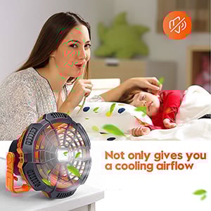 Fan & Lantern & Emergency Power:This portable USB fan combines a tent fan, a camping lantern, and an emergency power bank 3 in 1, which can help you keep cool in a hot tent and enjoy unrestrained outdoor activities at night.